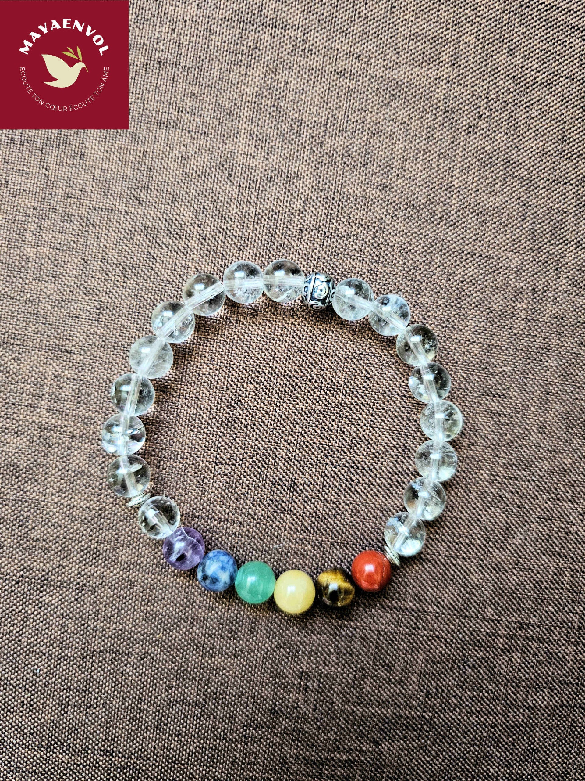 Bracelet 7 chakras en perles minérales de 8mm en cristal de roche/améthyste/sodalite/aventurine verte/aventurine jaune/œil de tigre/jaspe rouge. Cache perle ronde sculptée en métal argenté.