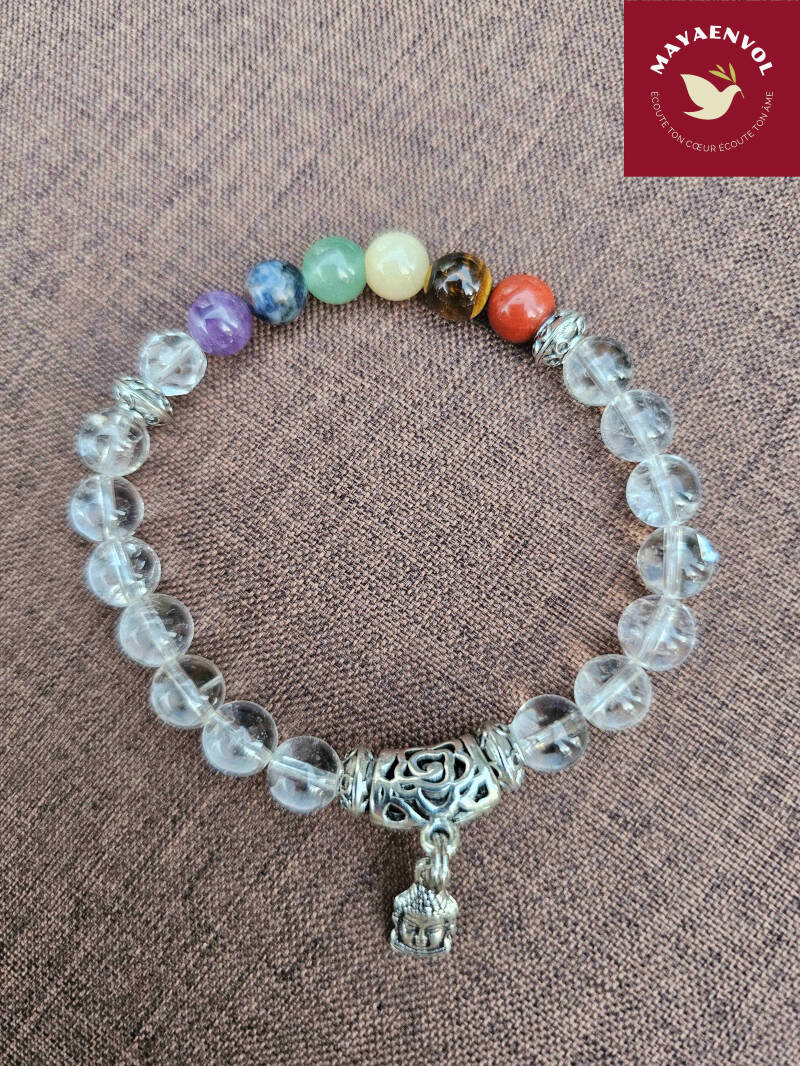 Bracelet 7 chakras avec majoritairement cristal de roche et les 7 perles de chakras : cristal de roche/améthyste/sodalite/aventurine verte/aventurine jaune/œil de tigre et jaspe rouge.