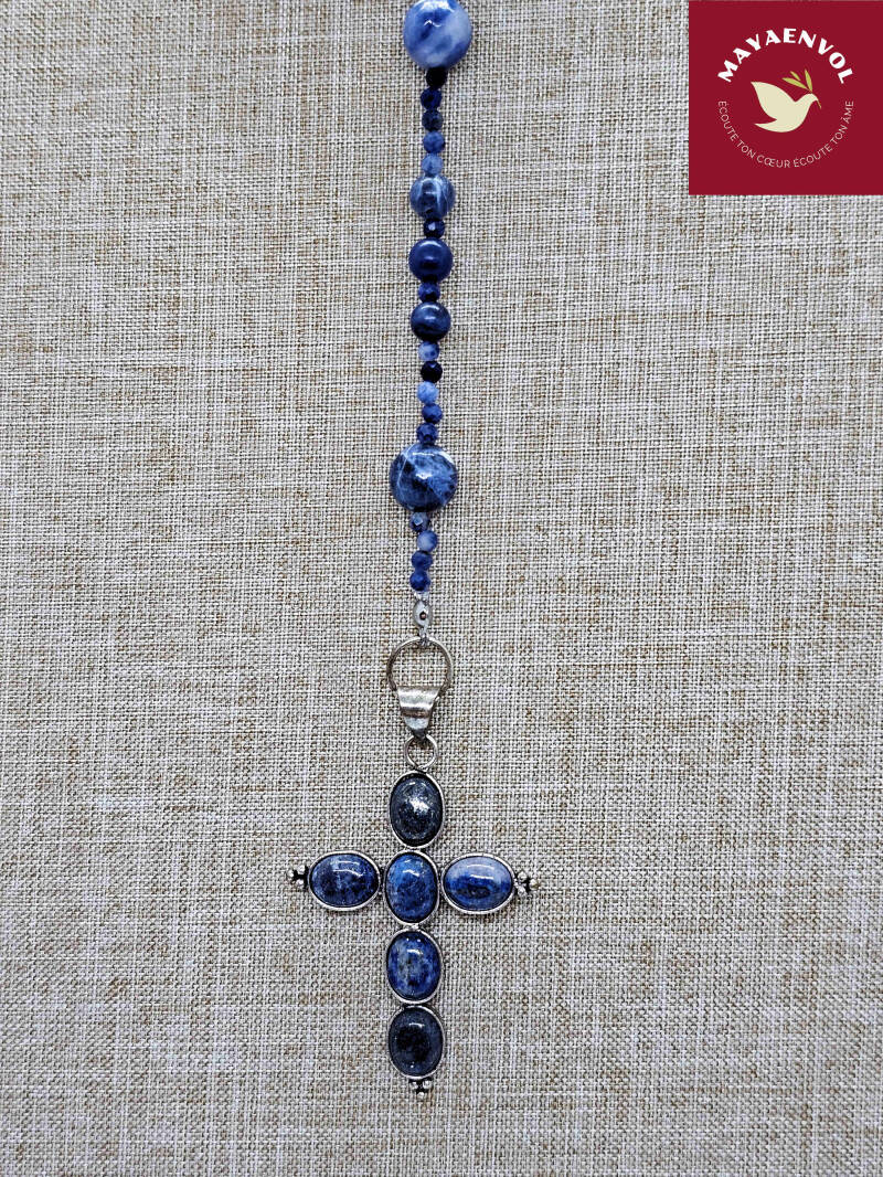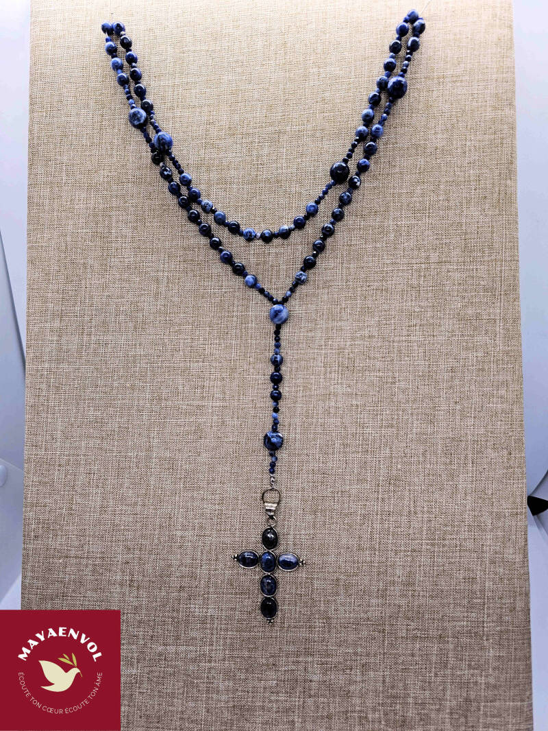 Les perles de sodalite ayant servi au montage de ce chapelet sont originaires du Canada. Elles font 1 cm (facettées), 0.6 cm et 0.4 cm de diamètre (facettées) ; la croix, d'environ 6 cm de hauteur, est en lapis lazuli. Le chapelet fait environ 64 cm.