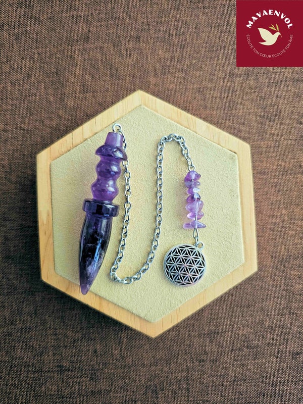 Pendule de Thot avec une très belle améthyste de 6.5 cm de hauteur. En bout de chaîne, plusieurs cristaux d'améthyste et un charme en métal argenté en forme de fleur de vie.
