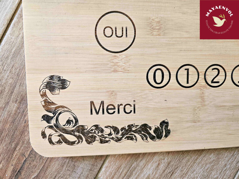 La planche est en bambou. Elle fait 53 x 36 x 0.1 cm ; ce qui en fait un Ouija de très beau format pour 5/6 personnes, sans être gêné lors du déplacement de la goutte.